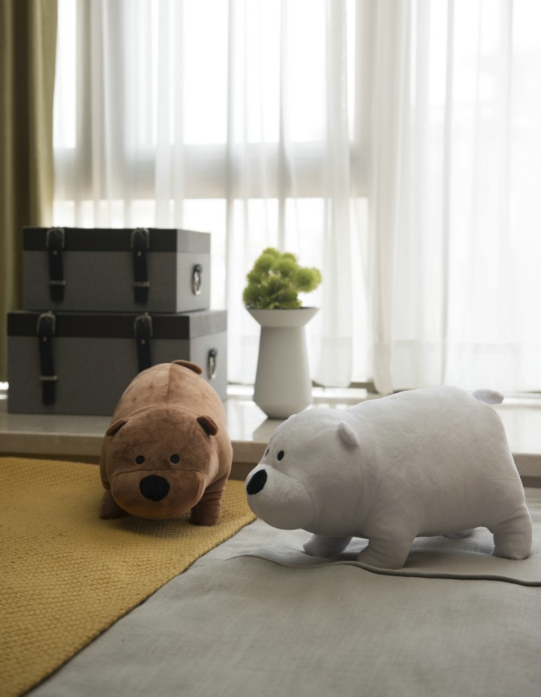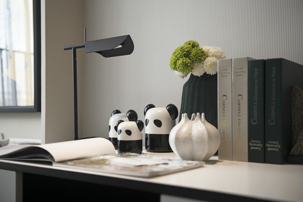 茶幾組合的材質(zhì)包括鉑晶、實(shí)木,金屬、石材與不銹鋼,多種材質(zhì)并攜掩映斜陽(yáng),墻面便投映出反射光線。日落時(shí),光線與背景墻上宛若玉盤的裝飾互相映襯,抽象展演月下波光瀲滟的景象??臻g在一片清雅之中,予人空靈澄澈的美感。